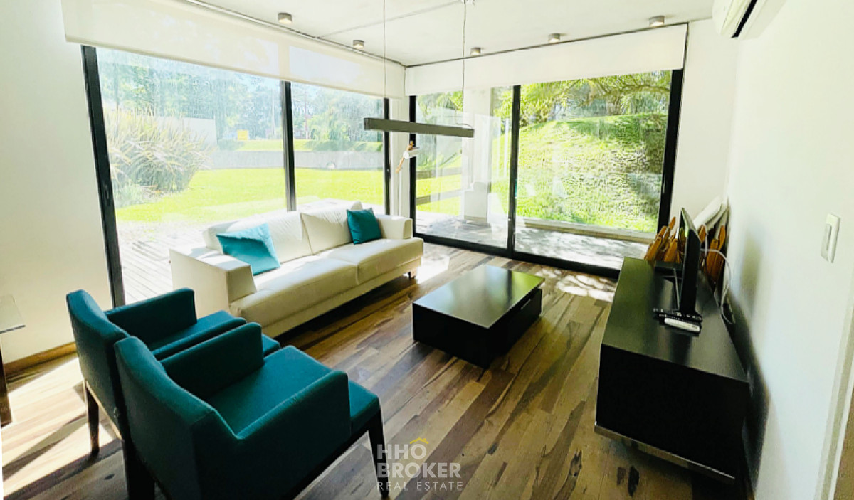 BE HOUSE, planta baja vistas de todos los ambientes a hermosos jardines, 2 dormitorios, uno en suite, 2 baños, living comedor con cocina integrada, terraza con acceso desde living, 2 dormitorio puede integrarse al living comedor a través de paneles móviles, excelente estado, garaje.