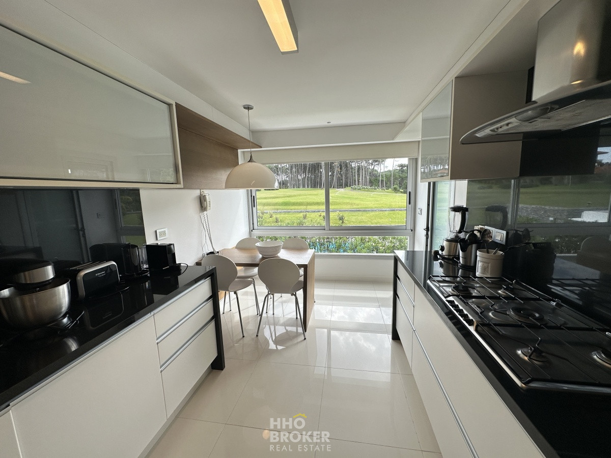 Hall de recepción, 3 amplias suites (la principal con muy cómodo vestidor), dormitorio de servicio en suite (se puede utilizar como 4° dormitorio). Muy amplio living-comedor. Cocina con desayunador y vista la bosque. Terraza con parrillero propio. Toilette.
