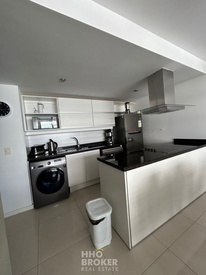 La cocina es integrada, generando un espacio moderno y funcional, ideal para la vida diaria o para recibir visitas.