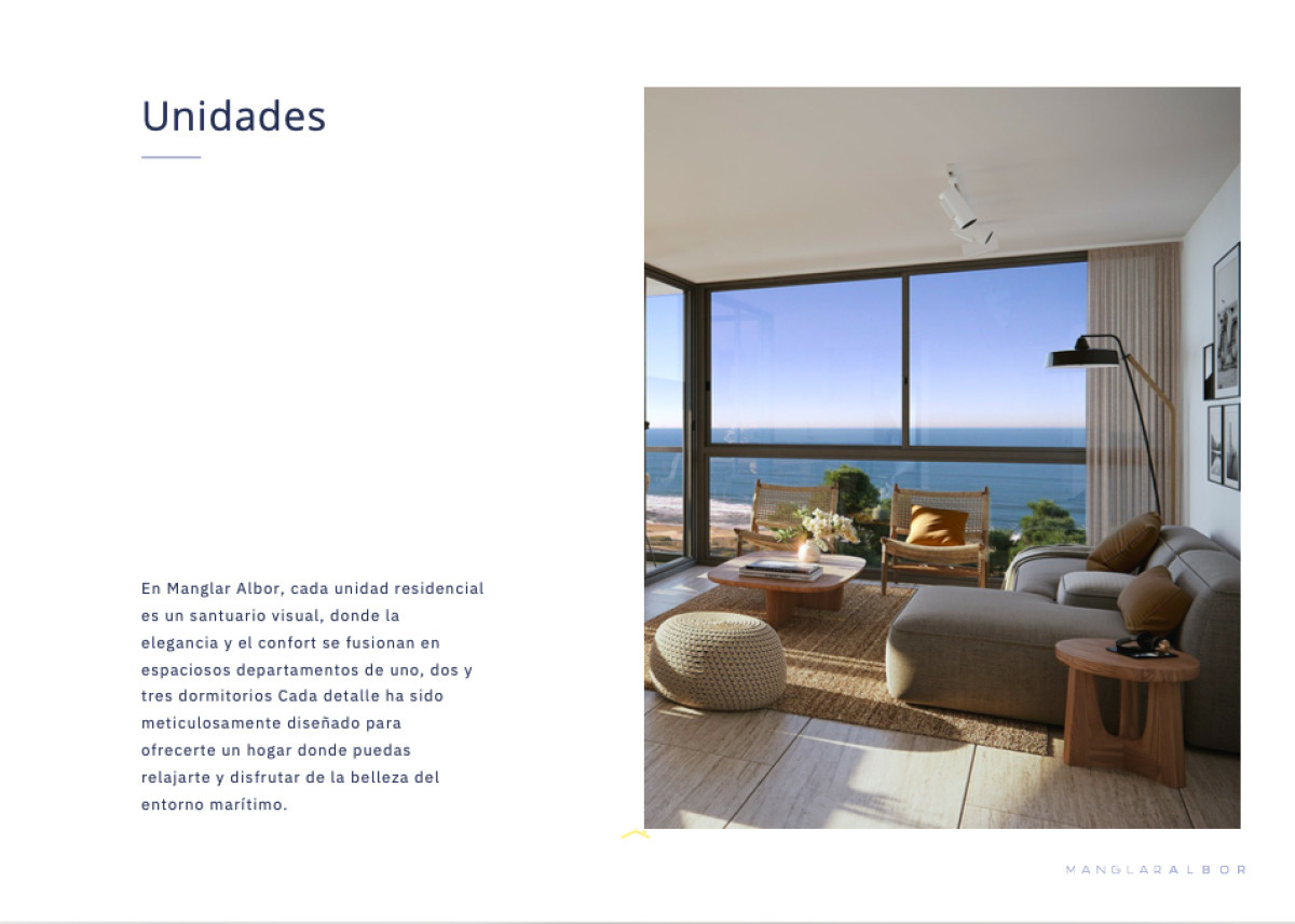 Ubicado estratégicamente en el eje entre la Playa Brava y Mansa, para vivir con la ventaja de encontrarse cerca de todo. Manglar Albor tiene la visión de que cada unidad residencial es un santuario visual, donde la elegancia y el confort se fusionan en espaciosos departamentos de 1, 2 y 3 dormitorios. Cada detalle ha sido pensado para ofrecerte un hogar a pasos del mar, donde puedas relajarte y disfrutar de la belleza del entorno.